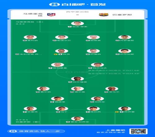 体育播报4月5日宣 北京时间4月5日3:00,西甲第30轮,马竞vs巴萨。赛前双方公布了本场比赛的首发阵容。【马竞方面,阿尔瓦雷斯和卢克曼均未首发,格列兹曼和阿尔马达搭档锋线;巴萨方面拉菲尼亚伤缺,弗里克赛前确认奥尔莫将出任伪9号位置。】