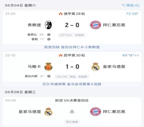 今天的联赛比赛,拜仁现在正0-2落后弗赖堡,而皇马则0-1落后马略卡。